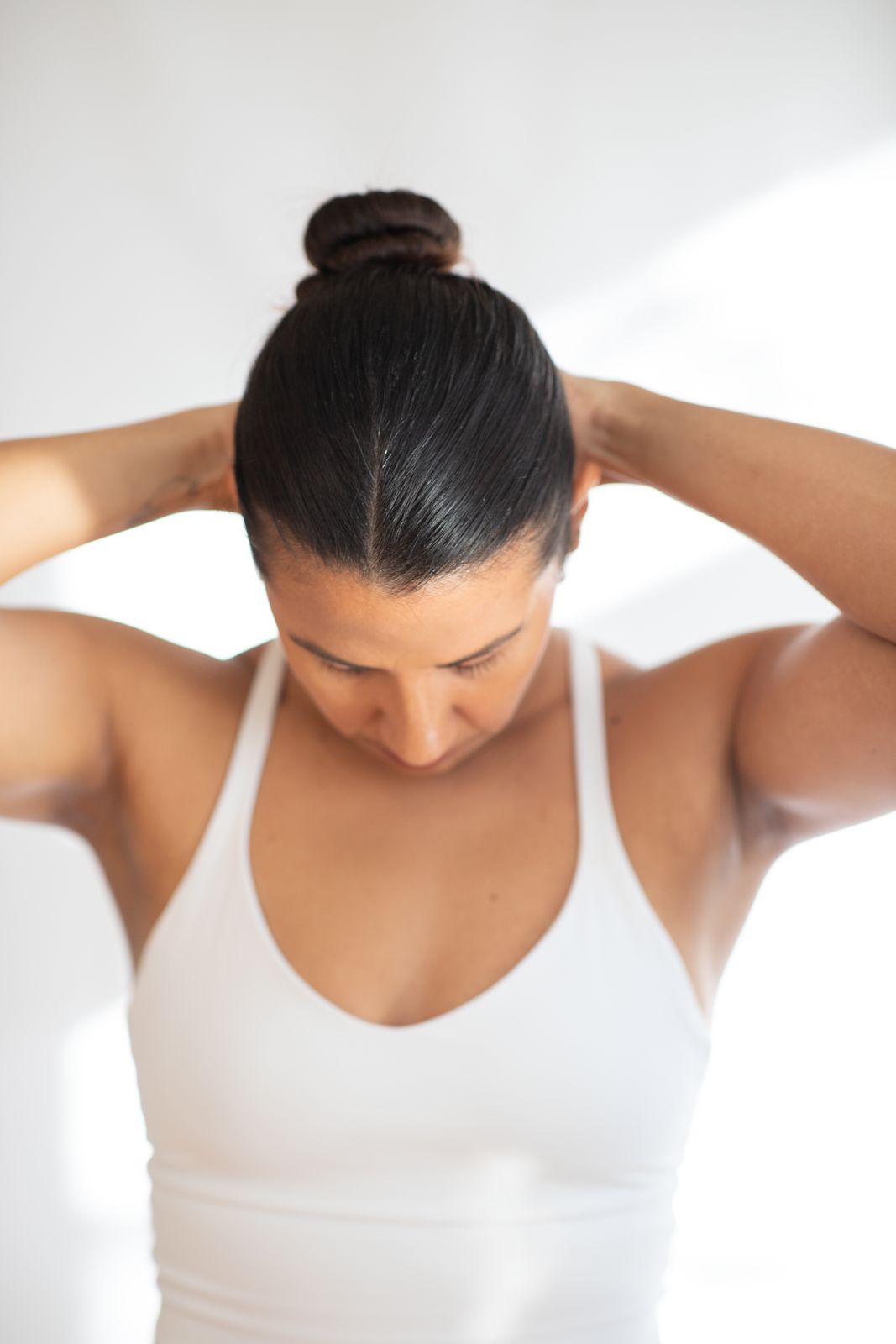 Before working on the forehead, it's important to loosen up the neck and shoulders. These two stretches will help you release stored tension that can contribute to forehead wrinkles.